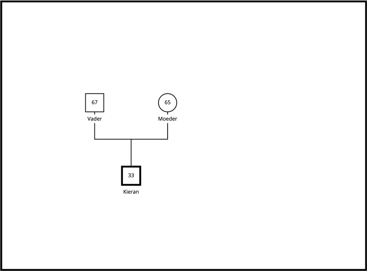 Vul het volledige familiesysteem in. Voeg broers, zussen, ooms, tantes, grootouders, (ex)partners en kinderen toe. Ook overleden personen, miskramen en doodgeboren kinderen kunnen in het genogram worden opgenomen. Houd rekening met de chronologische volgorde van geboorte: het oudste kind staat links, het jongste rechts, volgens onze leesrichting.