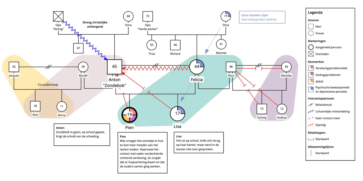 ”Jazeker, in dit voorbeeld laat ik het geanonimiseerde genogram zien van Pien (19). Ze is via een sociaal wijkteam naar mij verwezen voor contextuele therapie. Pien had ernstige verslavingsproblematiek en gedragsproblemen. We zijn met Pien en met beide ouders, Anton en Felicia, het genogram gaan maken.