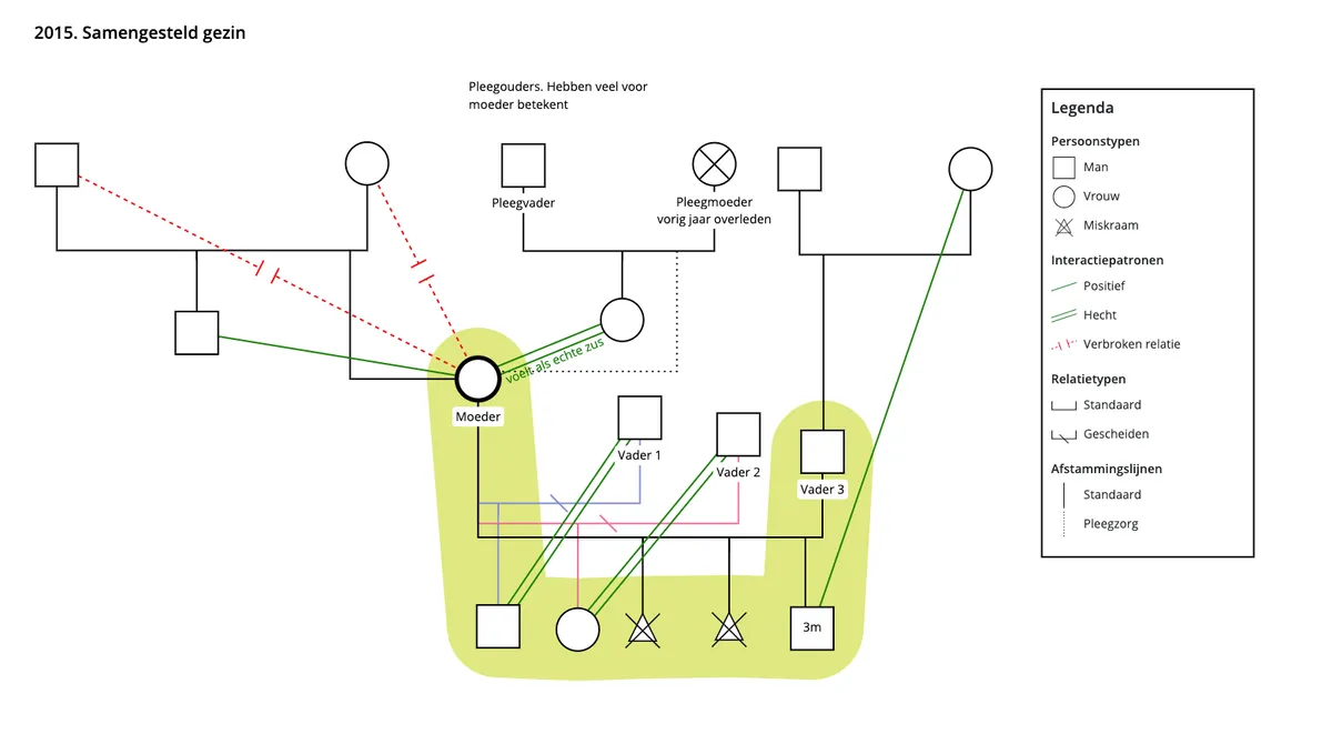 "Het is 2015. Ik begeleid een samengesteld gezin. Een moeder met kinderen van verschillende vaders waarvan een aantal nog steeds een grote rol spelen in het gezin. Moeder heeft zelf geen contact meer met haar ouders, wel nog met haar broer. Haar pleegouders hebben veel voor haar betekent, pleegmoeder is vorig jaar overleden, haar pleegzus beschouwt ze als echte zus. De moeder van haar huidige vriend (waarmee ze twee keer een miskraam heeft gehad en inmiddels drie maanden geleden is bevallen van een gezonde baby) is erg betrokken bij haar kleinkind. Snappen jullie het nog?