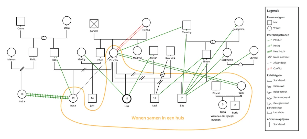 “Dit genogram geeft inzicht in wie bij wie er allemaal bij horen in deze familie. Ook de familiestructuur - het is een samengesteld gezin- kun je hierin teruglezen. Centraal staat dochter Lisa, zij is de aangemelde persoon. Haar moeder heeft kinderen van vier vaders. Er is met een gele lijn aangegeven wie er in een huis wonen: het gezin woont samen in een huis met vrienden van moeder en hun twee kinderen. Verder zie je dat degenen die steun geven aan de individuele kinderen zijn gemarkeerd met interactiepatronen - Ook andere interactiepatronen die belangrijk zijn in de dynamiek van de familie zijn aangeduid, zoals de interactie met de oudste dochter van moeder en met oma aan moeders zijde.