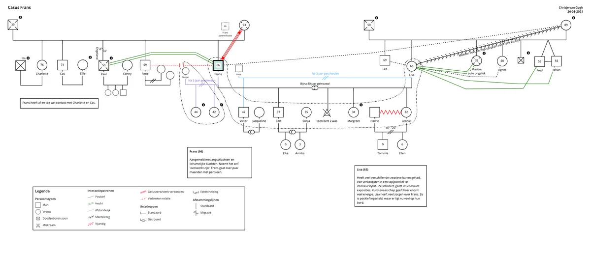 _Chrisje neemt ons nu mee in haar praktijk. Ze heeft een casus ingebracht die we gaan uitwerken in een genogram. De casus gaat over Frans. Frans zal over een paar maanden met pensioen gaan en hij wordt door angst en lichamelijke klachten genoodzaakt om terug te kijken op zijn leven. _